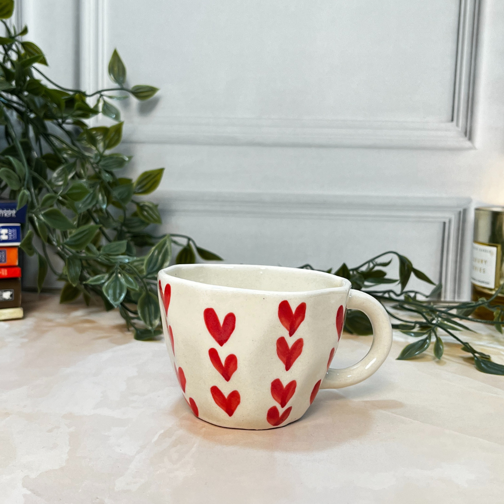 With a 250ml capacity, this 250ml ceramic cup holds the ideal amount of your favorite beverage. The bone-ash free ceramic cup is completely food grade ceramic mug, safe for daily use. Its sturdy construction makes this artisan handmade cup durable and comfortable to hold. The red heart coffee cup design adds charm to your kitchen, dining table, or office desk.