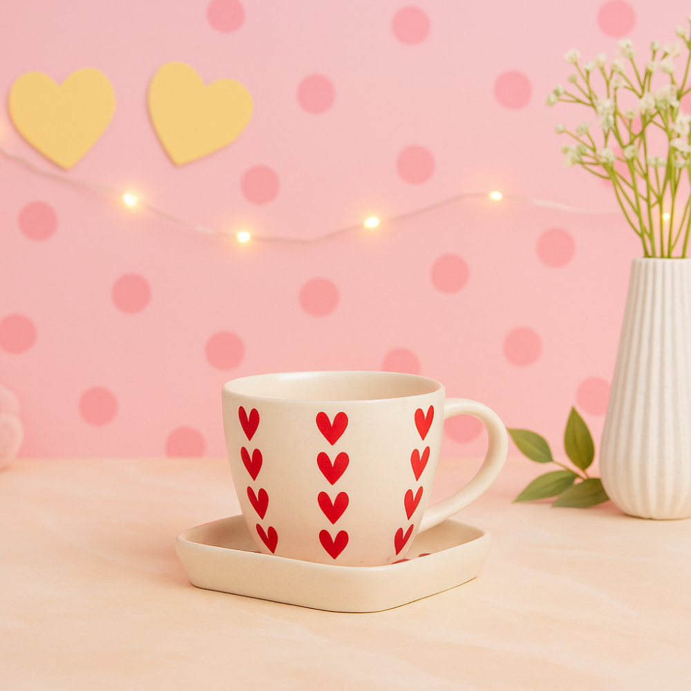 The Lovergirl Tea Cup with Saucer is your daily dose of cuteness and cozy. This red heart ceramic cup features dreamy red hearts and a snug saucer, perfect for your love-filled lattes, chai, or hot chocolate. Each Tavasyya red heart ceramic cup is handpainted ceramic cup and saucer crafted by skilled Indian artisans, making every piece unique. Whether it’s a special occasion or just a regular Tuesday, this tea cup with saucer brings joy to your daily routine.